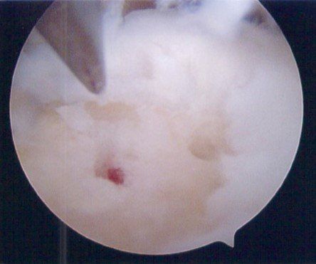 - cartilage debridement and micro-fracture (+/- application of hydrogel bioscaffold) to stimulate healing (see images below)