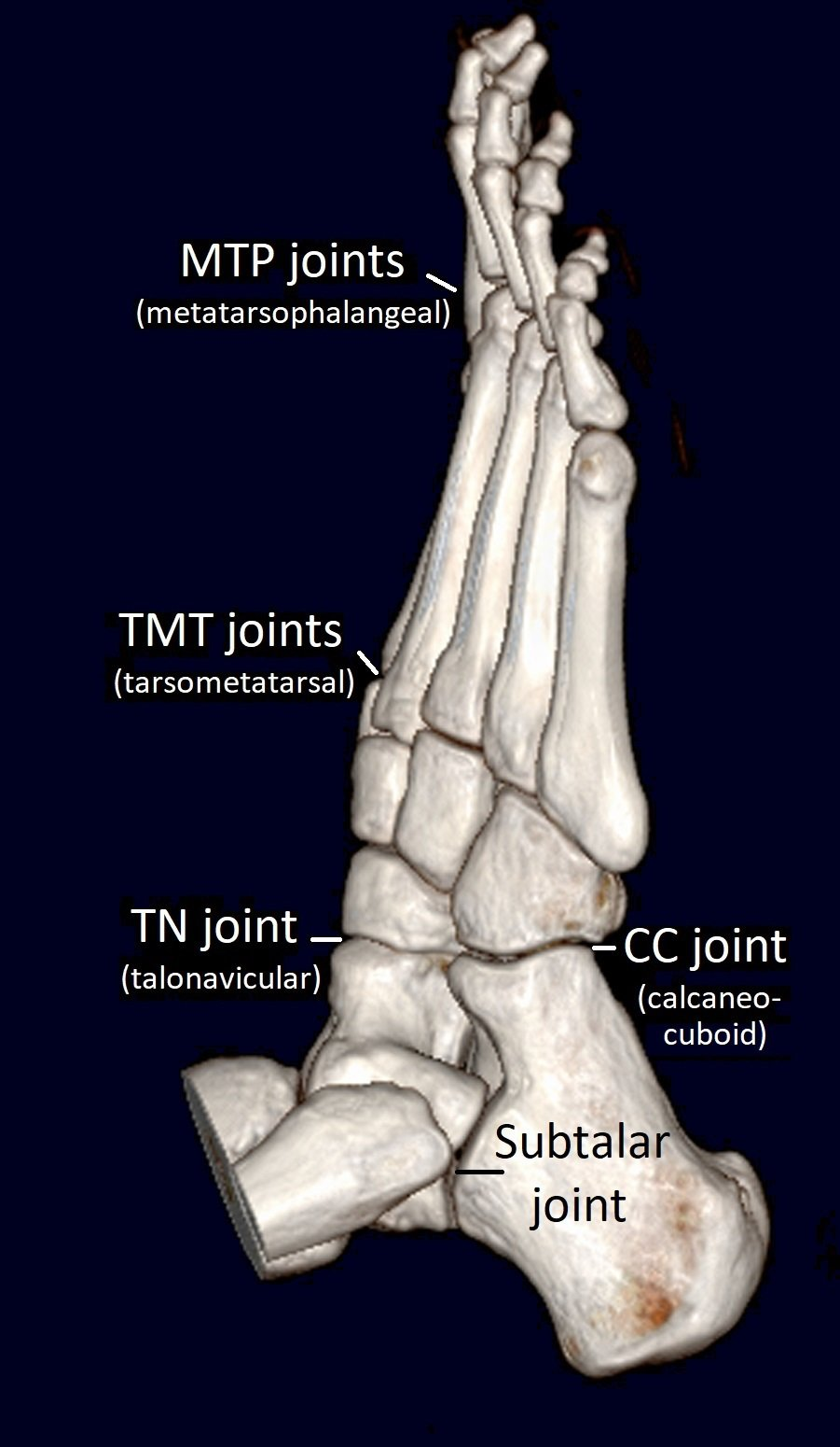 The foot is made up of the hindfoot, midfoot and forefoot. There are 26 bones and over 30 joints.