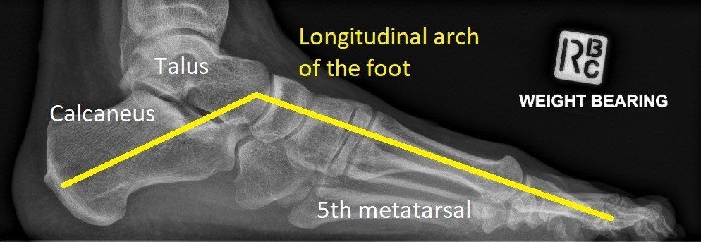 Weight-bearing X-rays of the foot show bone alignment, arch height and joint health.
