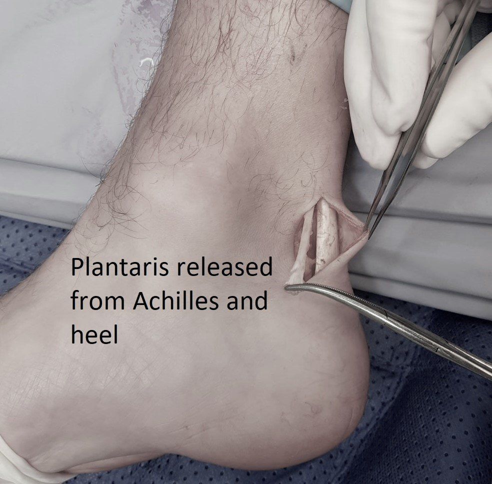 This surgical procedure involves releasing scarred and adherent paratenon from the Achilles tendon and removing a short length of plantaris. This does not weaken the Achilles tendon.